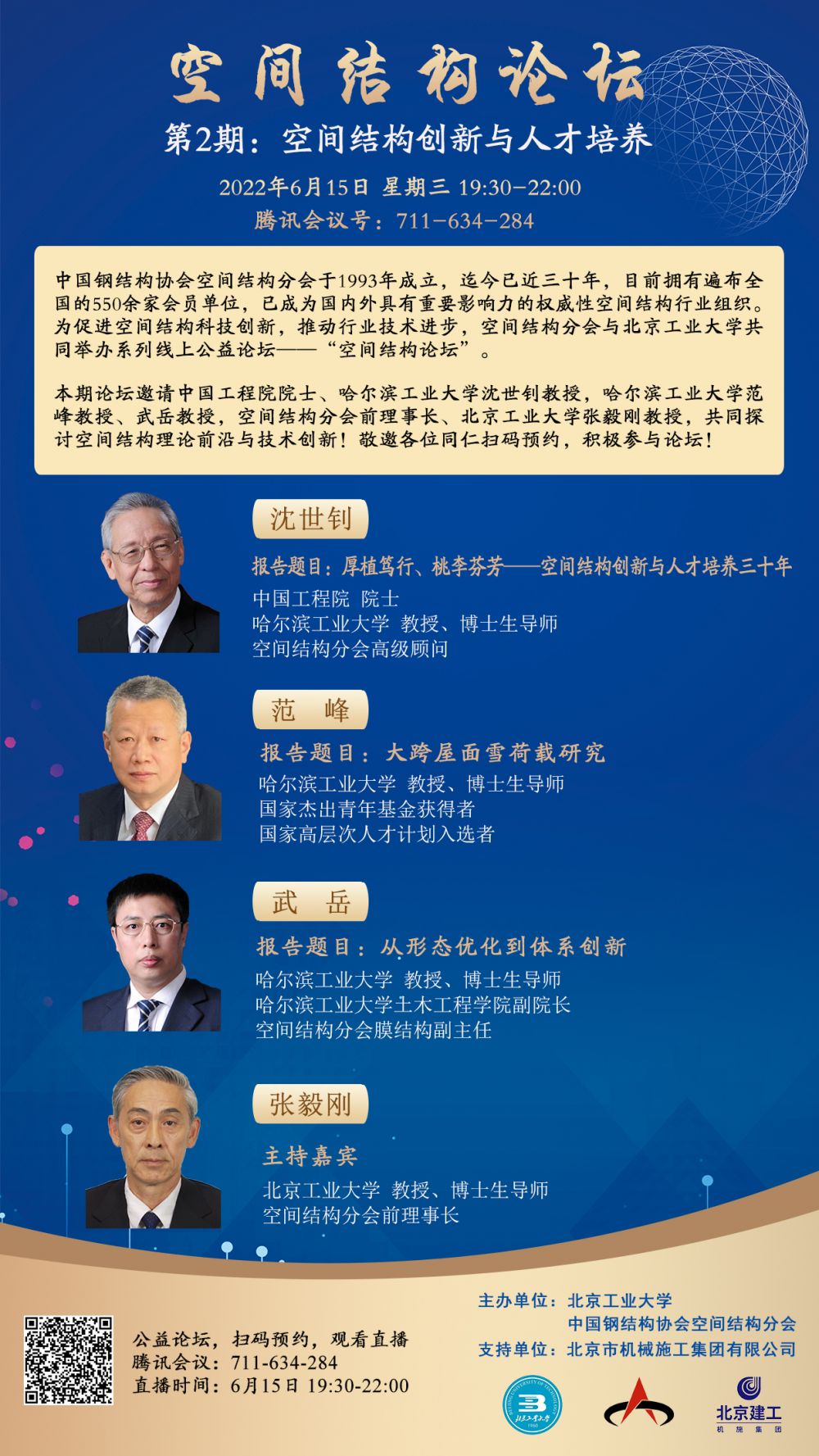 本期论坛邀请中国工程院院士、哈尔滨工业大学沈世钊教授,哈尔滨工业大学范峰教授、武岳教授,空间结构分会前理事长、北京工业大学张毅刚教授,共同探讨空间结构理论前沿与技术创新!敬邀各位同仁扫码预约,积极参与论坛!