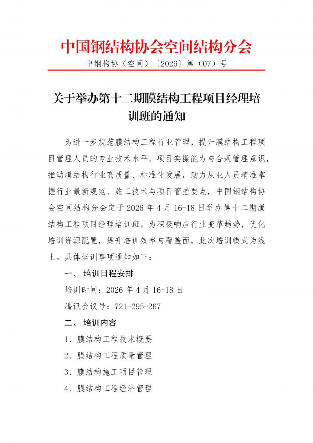 中钢构协(空间)2026年第(07)号-关于举办第十二期膜结构工程项目经理培训班的通知.pdf
